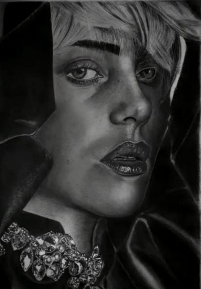 This is a hyperrealistc dark sketch of Billie Elish with heavy details on brustro paper .
